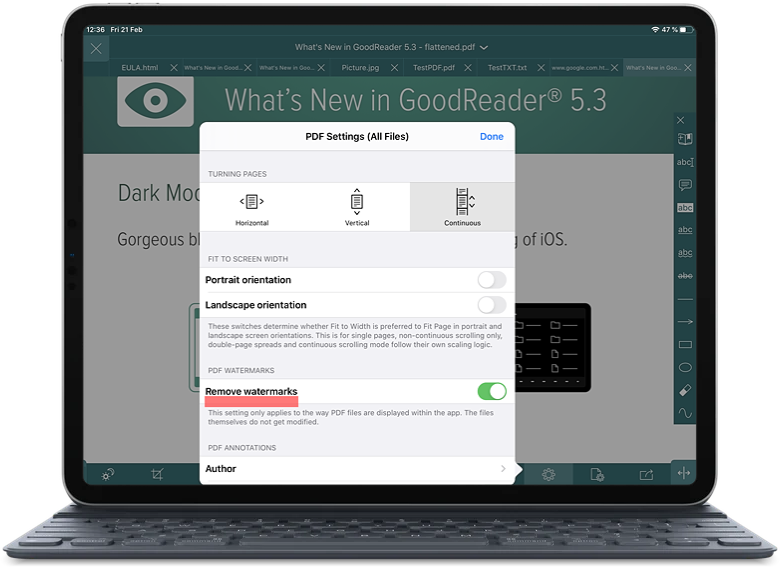 Some PDF files may contain annoying watermarks that are designed to show up only on printed copies but often appear in mobile device PDF viewers. GoodReader can hide such watermarks for you.
